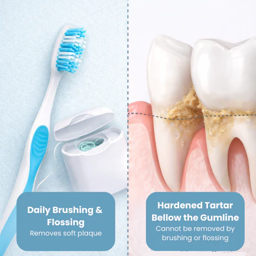 That’s because daily brushing doesn’t remove hardened tartar — and tartar is what quietly causes the most expensive dental problems.
